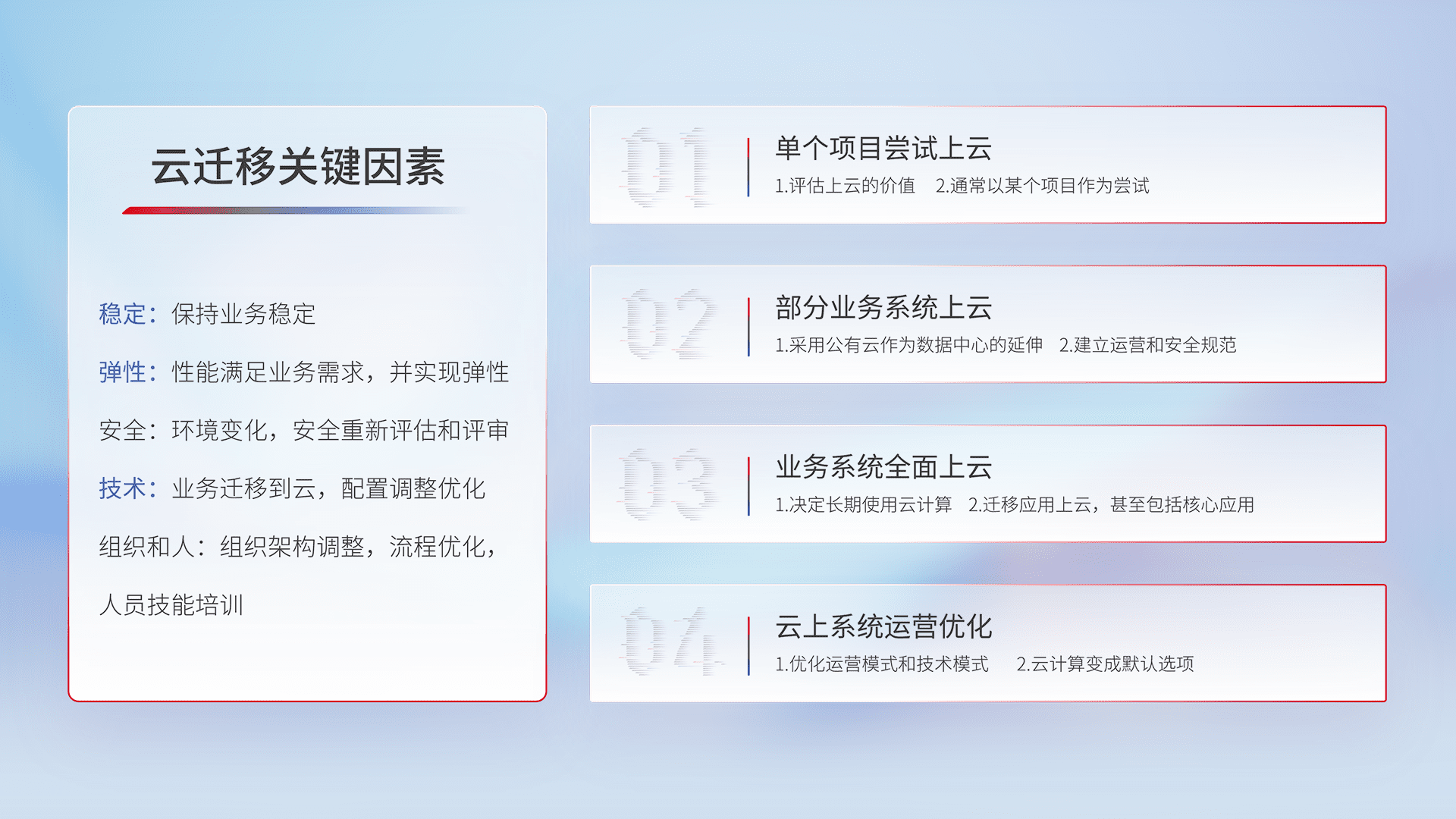 结合实际业务,,从规划设计、、云平台选型、、、云原生改造、、、、数据迁移、、、集成交付,,迁移全过程为客户识别最佳上云路径,,做好风险识别管理,,,设计网络架构、、身份权限、、、安全审计合规、、、、操作审计、、日志审计、、、、监控告警策略、、、多站点容灾设计等,,,对云上基础设施进行整体规划,,提升IT治理水平,,以满足弹性、、、、高可用、、、、高性能的需求。。。。