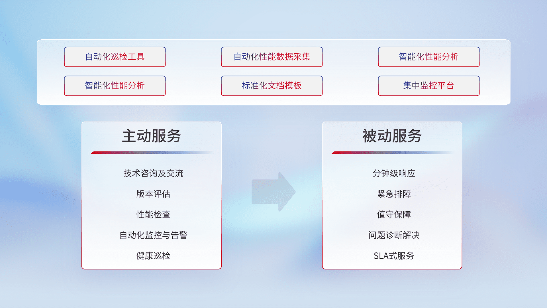 智能化工具和标准化文档,,,保障服务质量,,,提供主动服务(包含技术咨询、、版本评估、、性能检查、、自动化监控与告警、、健康巡检)和被动服务包含(分钟级响应、、、紧急排障、、、、值守保障、、、、问题诊断解决、、、、SLA服务)。。。